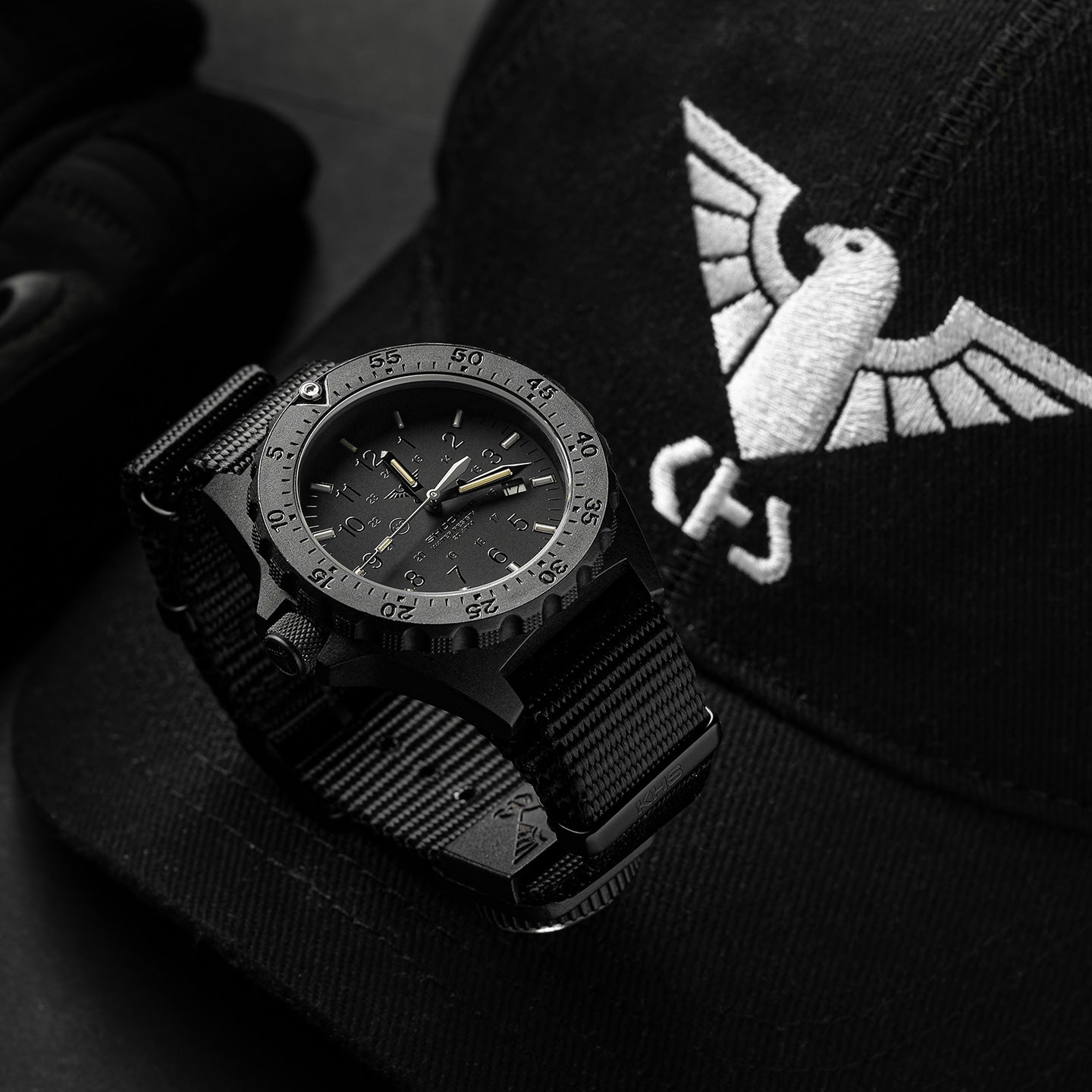 Bei den XTAC-Einsatzuhren sind alle Oberflächen und sämtliche Ziffern in schwarz gehalten. Selbst der Gehäuseboden und die Bandschließen sind genauso in schwarz gehalten.