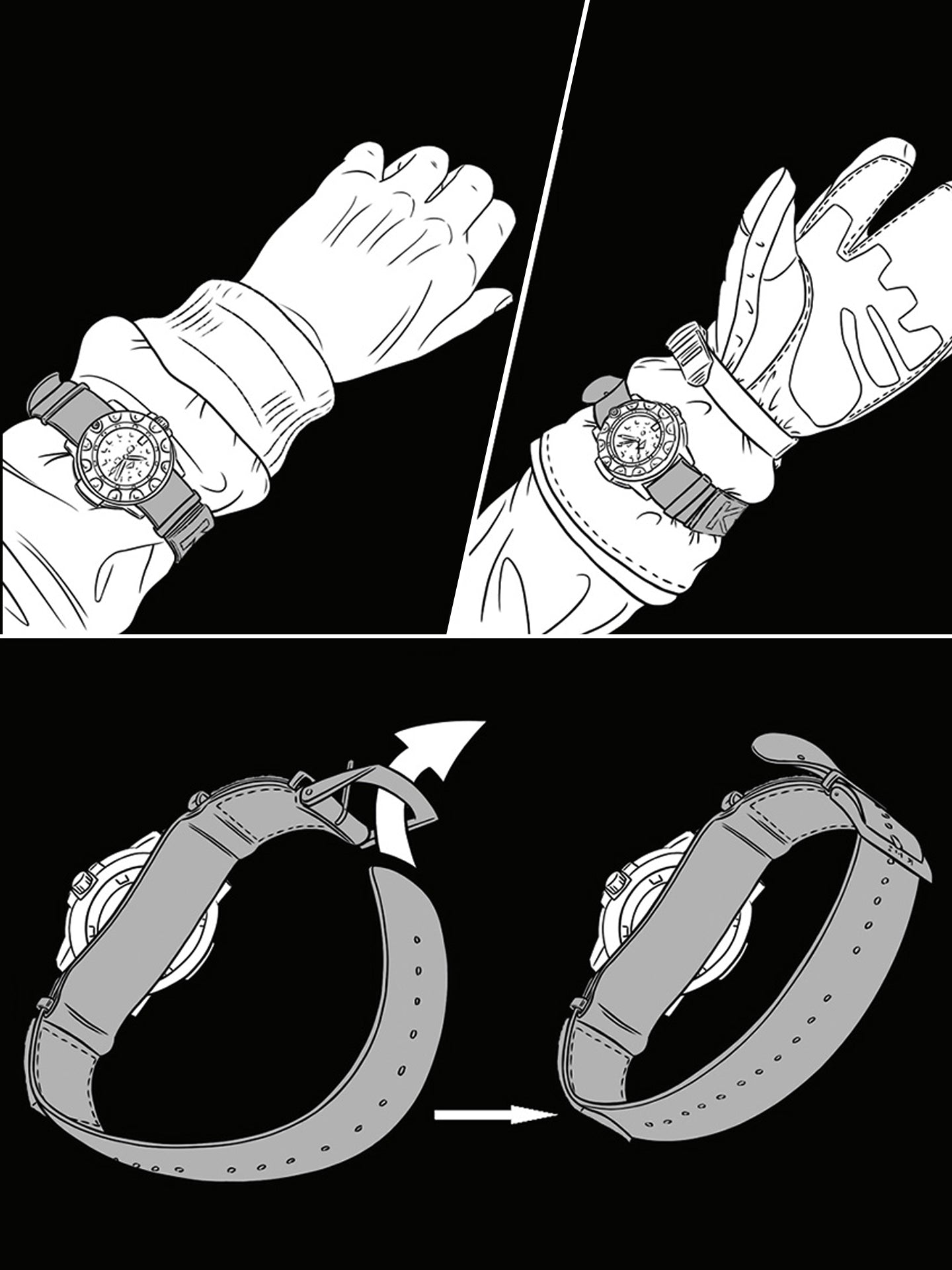 Anti-reflective IP-Black coated XTAC-clasp and loops made from stainless steel, sowie 2 velcro surfaces für Patches.
