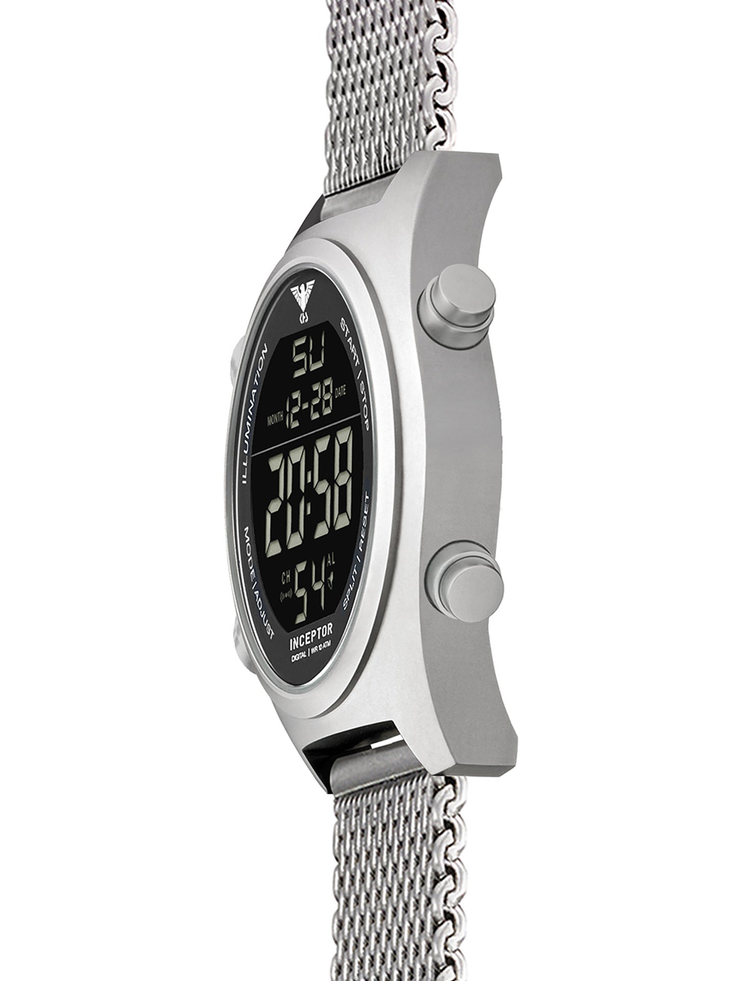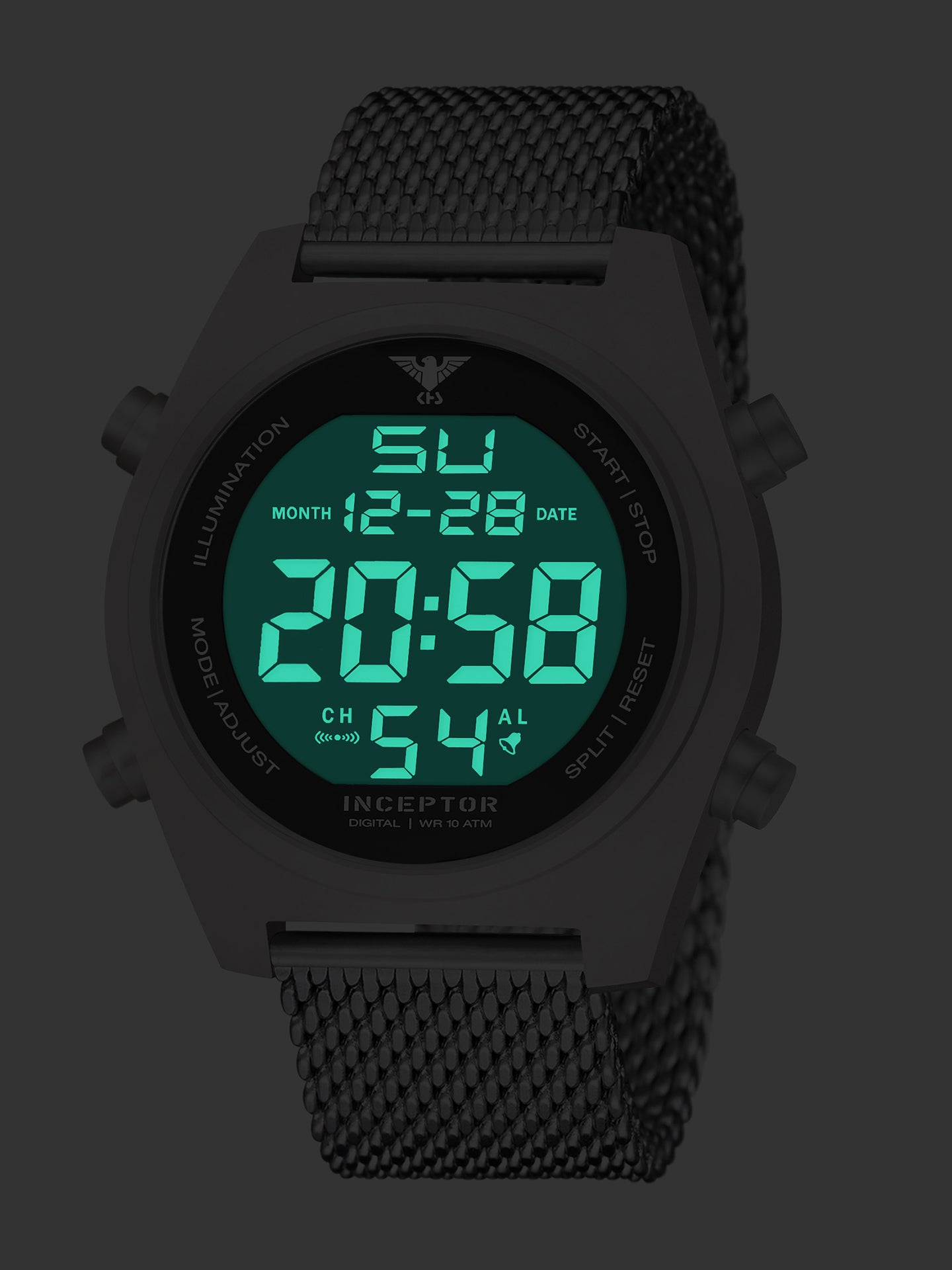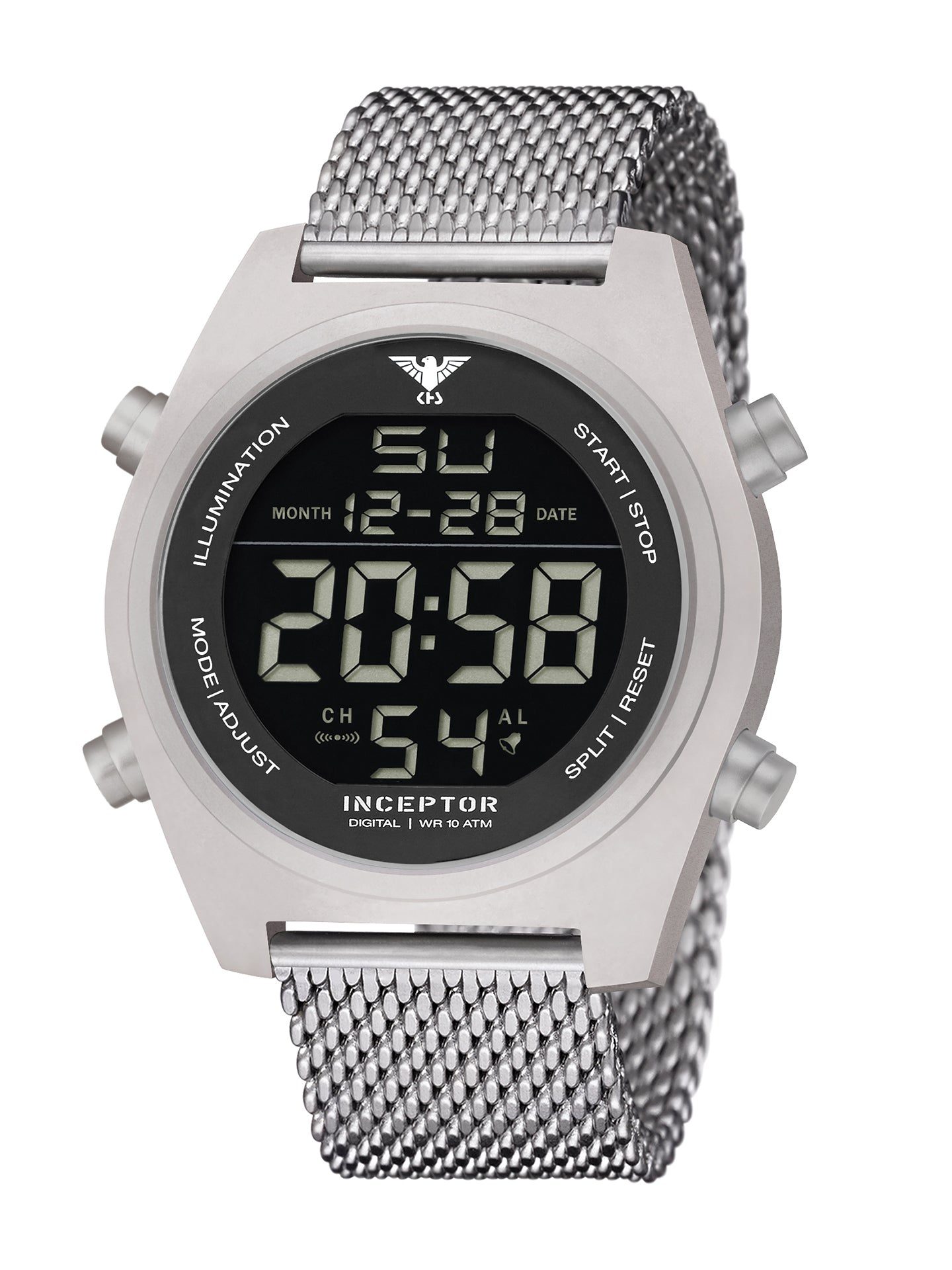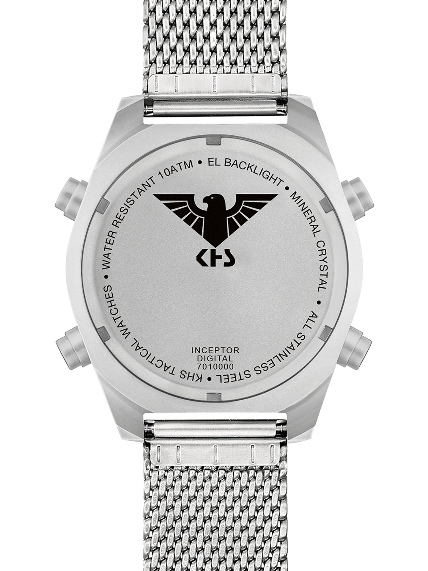 Die KHS Modellserie Inceptor lehnt sich an die bewährte U.S. Army-Spezifikation MIL-W-46374F für Spezialeinheiten an, bekannt auch als "GI Basic Field Watch“, diese wird an die meisten US-Amerikanischen Soldaten als Teil der Ausrüstung ausgegeben. Bei KHS ab sofort auch als extrem robuste Digitaluhr erhältlich! Die digitale Inceptor besitzt ebenfalls ein massives Edelstahlgehäuse mit einem verschraubten Gehäuseboden und dem im Einsatz bewährten, extra gehärteten Mineralglas. Über seitliche Edelstahl-Drücker können die Funktionen Chronograph (Stoppuhr), die Display-Hintergrundbeleuchtung und die Alarmfunktionen der Einsatzuhr gesteuert werden. Die Wahl zwischen 12- und 24-Stundenanzeige und einem stündlichen akustischen Zeitsignal stehen selbstverständlich ebenfalls zur Verfügung. Beeindruckende Qualität zu einem fantastischen Einstiegspreis in die Welt der taktischen KHS Einsatzuhren.