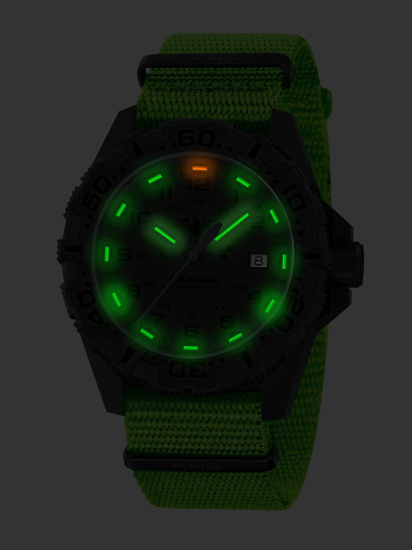 Diese KHS Einsatzuhr ist mit H3-Trigalights ausgestattet. Trigalights sind verschlossene, mit Tritiumgas gefüllte Glasröhrchen, die auf der Innenseite mit einer Leuchtfarbe beschichtet sind. Das Tritiumgas bringt die Leuchtfarbe zum Leuchten, dieser Vorgang geschieht permanent und sorgt dadurch für eine stets vorhandene Beleuchtung Ihrer KHS Einsatzuhr. Ein weiteres Highlight ist, dass die H3-Trigalight-Beleuchtung ohne Aufladung durch Licht oder Batteriestrom funktioniert.