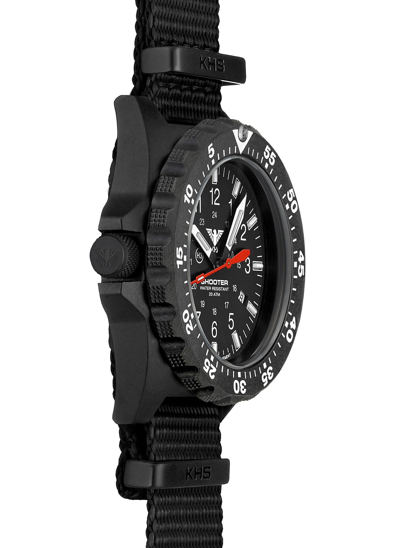 Bei den XTAC-Varianten der Modellserie Shooter MKII sind alle Oberflächen, Ziffern, das Gehäuse und die Bandschließe absichtlich in schwarz gehalten. Dadurch wird ein enormer taktischer Vorteil erreicht, da Reflektionen und auffällige Farben komplett vermieden werden. Diese KHS Einsatzuhr besticht durch ihre taktischen Besonderheiten!